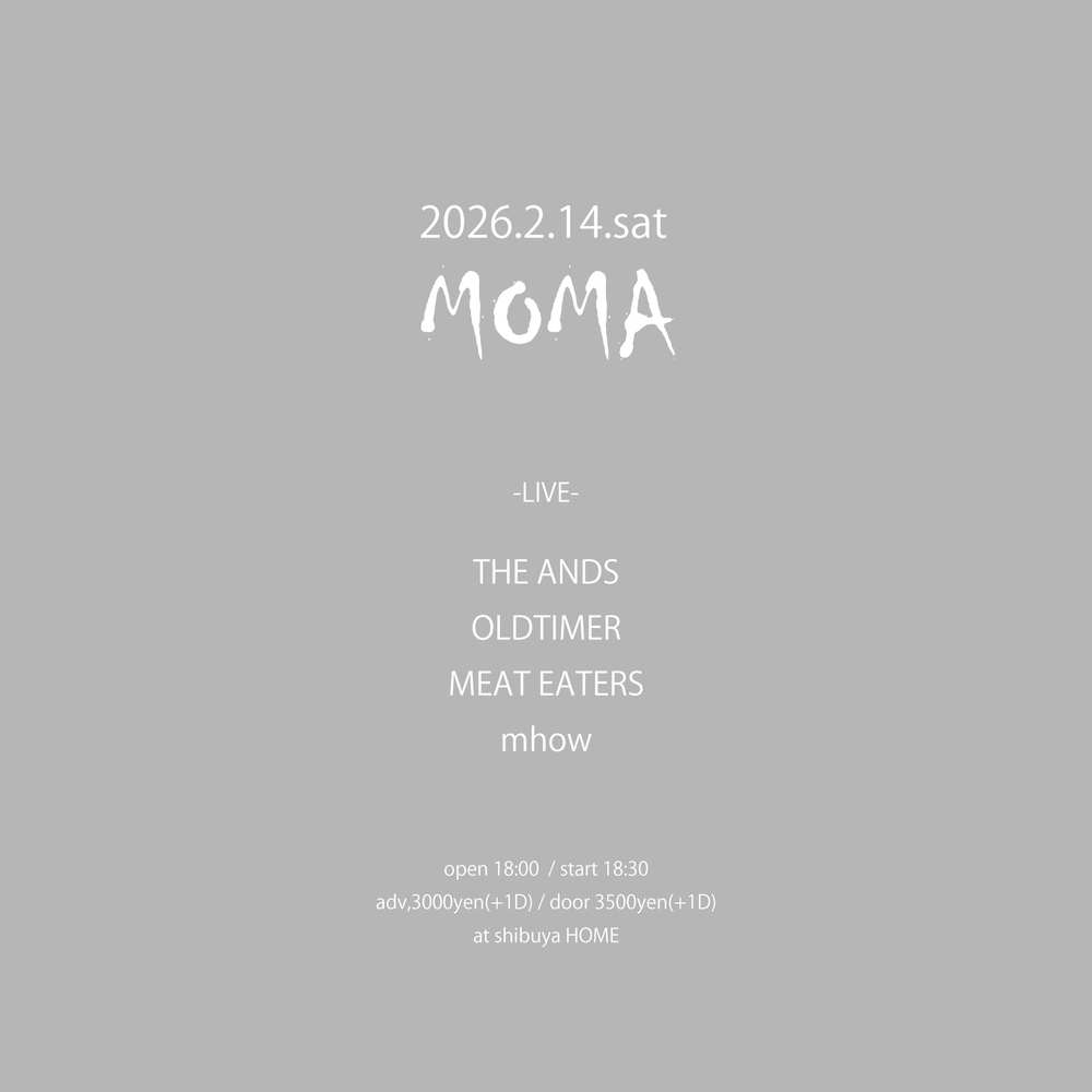 『MOMA』 SCHEDULE 2026/02/14(土) SHIBUYA HOME 地図を表示 open 18:00 / start 18:30 adv,3000yen(+1D) / door 3500yen(+1D) <ACT>THE ANDSmhowMEAT EATERSOLDTIMER取り置き&バンド予約 ticket reserve >>> URLをコピーする 報告する